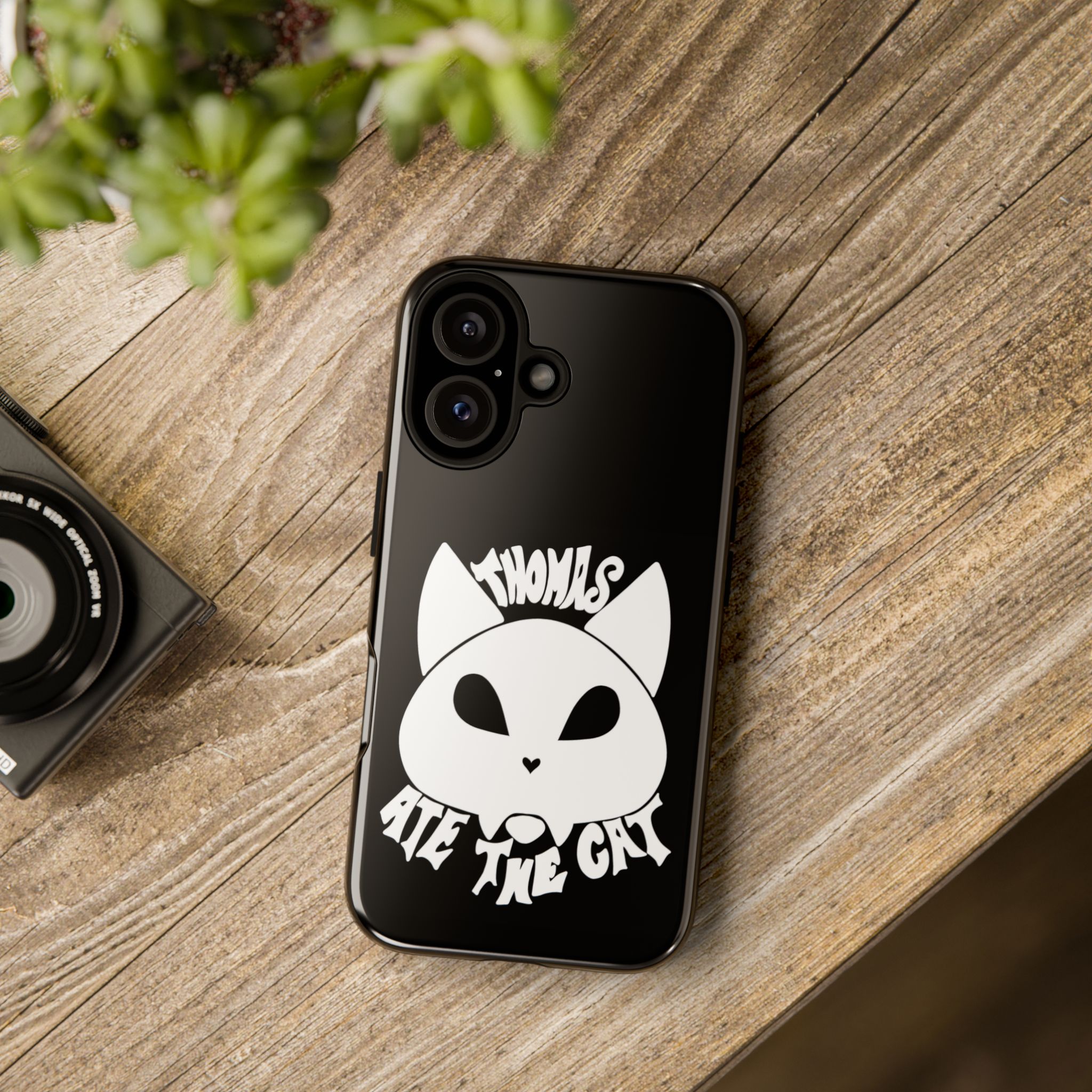 A sleek, protective phone case with a bold monochrome design that reads “Thomas Ate The Cat” beneath a stylized cat skull. The dual-layer build and silicone liner cushion drops while the glossy or matte finish keeps the graphic crisp. Lightweight and slim enough for daily carry, it slides into pockets easily while offering clear port access and wireless charging compatibility. The design suits people who enjoy dark humor, indie punk aesthetics, or statement accessories that spark conversations.